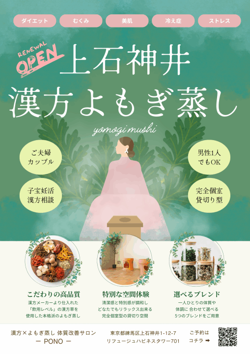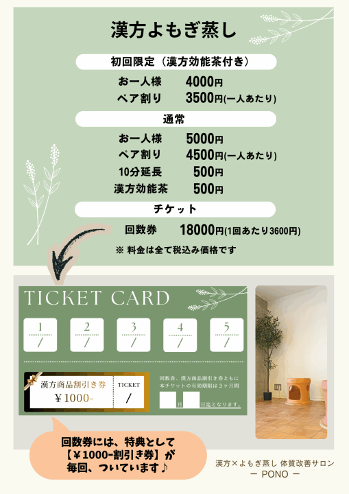 当店の「漢方よもぎ蒸し」に使用するよもぎ等の草は、漢方メーカーから仕入れた高品質かつ安全性の高い「飲用レベル」のものを使用しています。ただ、よもぎ蒸しをしたいというだけでなく「効果を実感したい」「体質改善をしたい」という方にも違いを感じて頂けます。